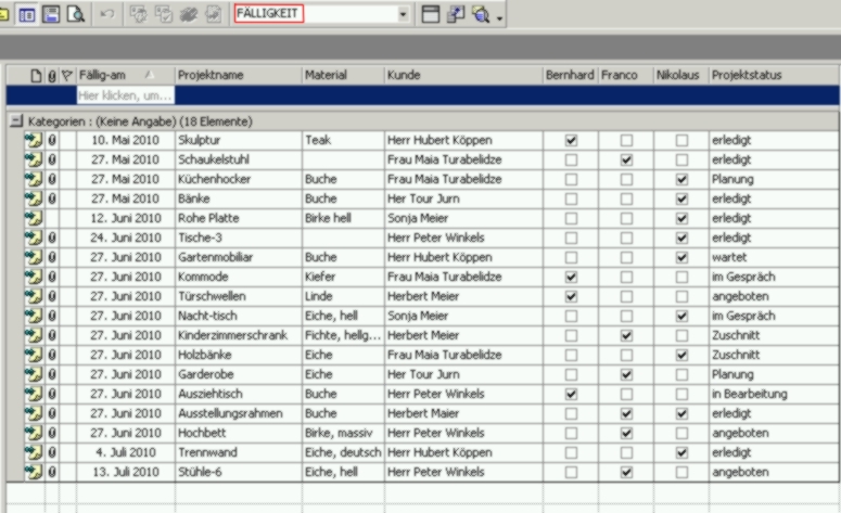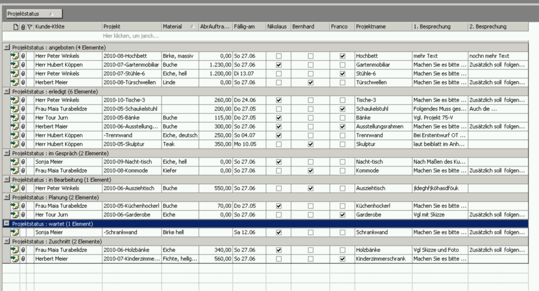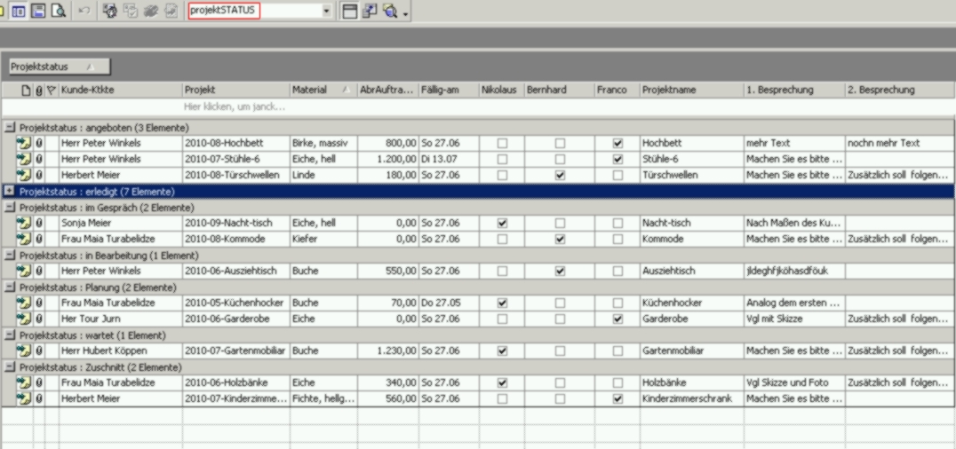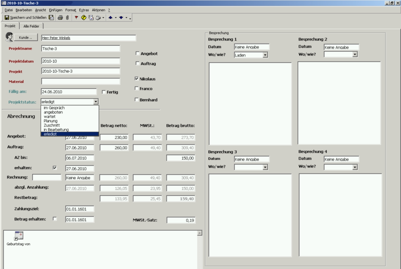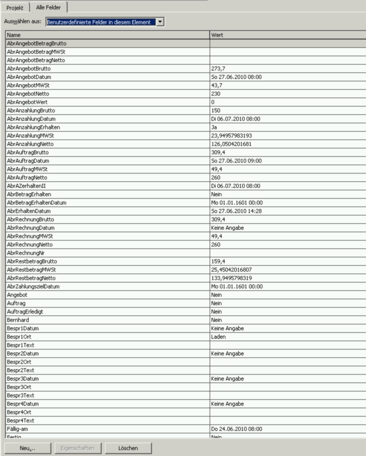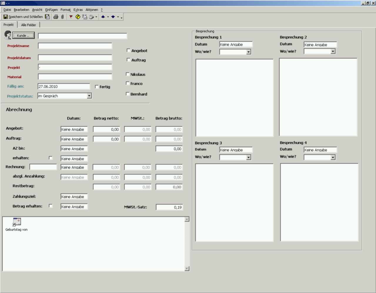 Hier ein Beispiel für ein neues Eingabe-Formular für Projekte, die in einem Kontaktordner verwaltet werden – unabhängig von den eigentlichen Kontakten: Der Kunde wird aus den realen Kontakten gezogen, der Projektname ist (bei Bedarf) ergänzbar um Projektdatum, was dann den vollen Namen ergibt (Projekt).